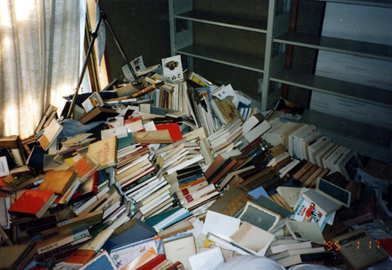 阪神大震災直後の家の中。尿路結石で救急車に乗り込んだ直後に地震が来たため、間一髪で大怪我を免れた。 |
