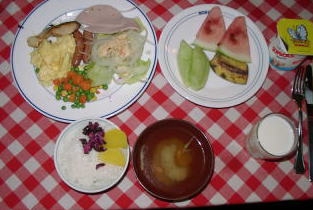 食事はモーニングティ、朝食、昼食、ティータイム、夕食、夜食の6食あるが、私は3食で10分であり、たまにティータイムに行ったくらいで、1度もモーニングティも夜食も取らなかった。船の食事は朝食、昼食はバイキング形式、夕食はセッティングのロシア料理であった。「ピースボート」のリピーター達は乗るごとに食事がよくなると異口同音にいう。コック長として日本人I氏がウクライナ人コックを指導してかなりの日本料理を作る。朝食には毎日、味噌汁、梅干、漬物、海苔、納豆が出るのがうれしい。昼食もソーメン、そば、湯豆腐、おでんと日本料理系のものが出ると逃さず取った。デザートが豊富で、果物の種類も多い。中でもスイカが大人気であった。夕食のロシア料理もずいぶんと日本人の口に合うように工夫さていてまずまずであった。節分とか雛祭りにはそれに相応しい懐石膳も出た。何よりもこれは気楽な船であった。時々フォーマルディナーもあったが、ネクタイは皆無に近く、替え上着程度の軽装でいいのが助かった。普段はTシャツにGパンで過した。