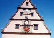 にか人形が動いたらしいと思うとやがて扉が閉まってしまった。私は呆気にとられて何が何だか分からなかった。見上げていた日本人は一斉に「なにー?」とどよめく。大勢の人形が派手なアクションを繰り広げる仕掛け時計を見慣れている日本人にはそのあまりに古風な仕掛けにただ呆れてしまったのだ。私は仕方なしに扉の閉まった時計台に向かってシャッターを切った。帰って数日後、写真が出来上がり、友人夫妻にその写真を説明していた妻が、これはカトリック軍に包囲されたときカトリック軍のローマの将軍が「ブドウ酒三・二五リットルを一気飲みしたら街を攻撃するのをやめる」という講和の条件を出したとき、時の市長が見事飲み干してローテンブルク市を救った記念の仕掛け時計だといっているではないか。私はその時始めて仕掛け時計の意味が分かった。そうか、あの人形は市長マイスター・トゥルンクで、あれは一気飲みをしたのであったのか。それでは、あの人形が動いた時がシャッターチャンスだったのか。私は大急ぎで撮り損なった場面を復元する。人形がジョッキを手に持ってぐいっと傾ける見なかったはずのデテールまできっちりと復元してしまうのは恐ろしい。