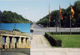 (写真上は戦勝塔から獣苑(ティアガルデン)を望む。その果てにブランデンブルク門がある。左下はブランデンブルク門、