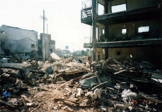こうして私はこの日と次ぎの日、痛みの中で暮らし、テレビも見なかったので地震がどうなったのかを知らなかった。テレビは例によって、あらゆる番組を吹っ飛ばして、地震の特別番組を流し続けていたらしい。テレビで神戸の惨状を知った私の親族たちは全国から私めがけて電話をかけ続けていた。その時神戸の電話はパンク状態で、95パーセントが不通であったという。そんな電話の一本が18日夕方偶然に繋がった。私は事態の深刻さに初めて気づいた。私はテレビをつけてみた。しかしテレビのあるリビングも本立が倒れ、本は散乱したたまま放置されていて、テレビを見るにいい環境ではなかった。だから私は以後テレビをあまり見ていないから、その報道について何か言う資格はない。しかし見ていると、どのテレビ局も同じ映像を繰り返し放映しているのではないかと思われた。衆人の耳目を集める地というか、テレビ映りのいい地というか、一度スポットが当たると、震災名所とでもいうように繰り返し報道される景観がある。映像は固定化された分だけ被災の広がりの現実は捕らえられていなかった。例えば長田区、ここは被災直後から火事の映像が入り、その焼け跡が映り続けた。それは戦場の惨禍を思わせる衝撃度の高い絵として人々の目を引きつけた。長田は今度の震災の一つの中心であり、その悲惨な映像は神戸の災害の典型として全国に発信され続けた。一方隣の須磨区の映像は報道されることはなかった。須磨は無視され続け、周縁に押しやられ、あたかも震災を受けなかったかのごとくであった。でも淡路に端を発する活断層は須磨から長田を経て三宮を通り灘・東灘・芦屋・西宮に至っていた。須磨は震度7の激震地の線上にあり、その被害は決して小さくはなかった。確かに長田の災害はあまりにも衝撃的ではあったが、地震の被害は長田区で終わった訳ではない。