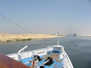 紅海と地中海を結ぶスエズ運河は171キロあって、右にシナイ半島と左にアフリカ大陸を見ながら1日かけて航行する。両岸ともに延々たる砂漠で、エジプト側にはたまにリゾート地が現れるが、一日中荒涼たる風景が続く。船の全企画が休止し、クルーも仕事がないのか避難訓練をしていた。