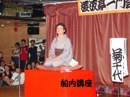 ケニアから落語家の「古今亭菊千代」さんが水先案内人(ボランティアの講師)として乗船してくる。女性初の真打である。船で落語が聴けるなんて望外の幸せである。「初天神」「たらちね」「おたのみ」などを聞く。この人が弟子を募集して「渡波亭一門」と名づけて最後に発表会をするという。わが師Mrヒロは好奇心旺盛、何事にも積極的な人で「渡波亭」に入門して、発表会で「渡波亭弘菊」名乗って「酒の粕」という長い落語を語ることになった。当日手品教室の生徒は最前列に陣取り「待ってました!弘菊!」と声をかける。これが楽しくて私など三回も叫んだのであった。それにしてもあの長い「酒の粕」をよどみなく語るMrヒロの記憶力には舌を巻く他ない。