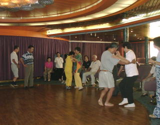 3月14日の新聞のタイムテーブルを見ると、「社交ダンスへの道(初心者になるためのキソのキソ)」と出ているではないか。社交ダンスも私の新しい遊びの候補の中に入っていたのだが、これはどうしてか怯むところがあり、こわごわ覗いて見た頃にはもう基礎は過ぎて、私の手の届くレベルを超えていた。もうこのクルーズでは新しい遊びは駄目かとあきらめかけていた時、まるで私のために作られたのではないかと思う企画が現れたのである。ラストチャンスとばかり船底のミラーバーへ行く。テーブルと椅子を片付けて小さなホールを作り、Oさんを指導者とする初級ダンス教室が始まる。自主企画「合気道」ですでに体が堅くて落ちこぼれていた私はここでも覚えがわるくてみんなについて行けない。ともすれば後ずさりして人陰