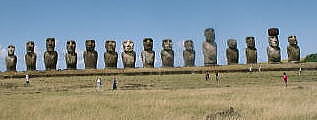 イースター島はモアイ像の島である。昔は集落ごとに村の守り神モアイの巨大な石像を立てていたらしいが、今では集落はなくモアイ像だけが残されている。中でもアフ・トンガリキの15体のモアイがずらりと並んで立っている様は壮観である。身長も顔立ちも、多少の違いはあるが、目玉がない窪んだ目と真1文字に結んだ小さな口をしていて、とぼけた哲学者のような顔立ちから飄々として威厳のある気分が伝わってくる。横から見た姿も表情豊かで、長い耳、高い鼻、尖った顎と細い手から繊細な知性が漂ってくる。太古から悠久の時間を見ていたような静謐な相貌で立っているが、実はチリ地震の津波で散乱していたのを、最近日本の建設会社がクレーンを持ち込んで修復したのだという。こんな地の果ての孤島で、遺跡再建に取り組んでいた日本人もいたのかと感動する。
